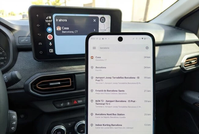 Un pequeño cambio y una gran mejora. Usar Waze en el coche implicaba restringir la interacción exclusivamente a la pantalla del salpicadero. Y no es que Android Auto ponga las cosas muy fáciles a la hora de escribir en ese panel: las pulsaciones son más lentas, el teclado puede tardar en salir y tener cierta imprecisión. Que el teléfono sea un soporte de búsqueda supone una mejora considerable.
